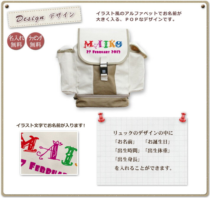 「お名前」と「お誕生日」の他、「出生時間」や「出生体重」も入れることができるリュックサックです。