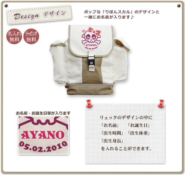 誕生日 名前入り プレゼント 男の子 女の子 キッズ リュックサック 人気のスカルデザイン!お名前入りの「りぼんスカル」のデザインです。